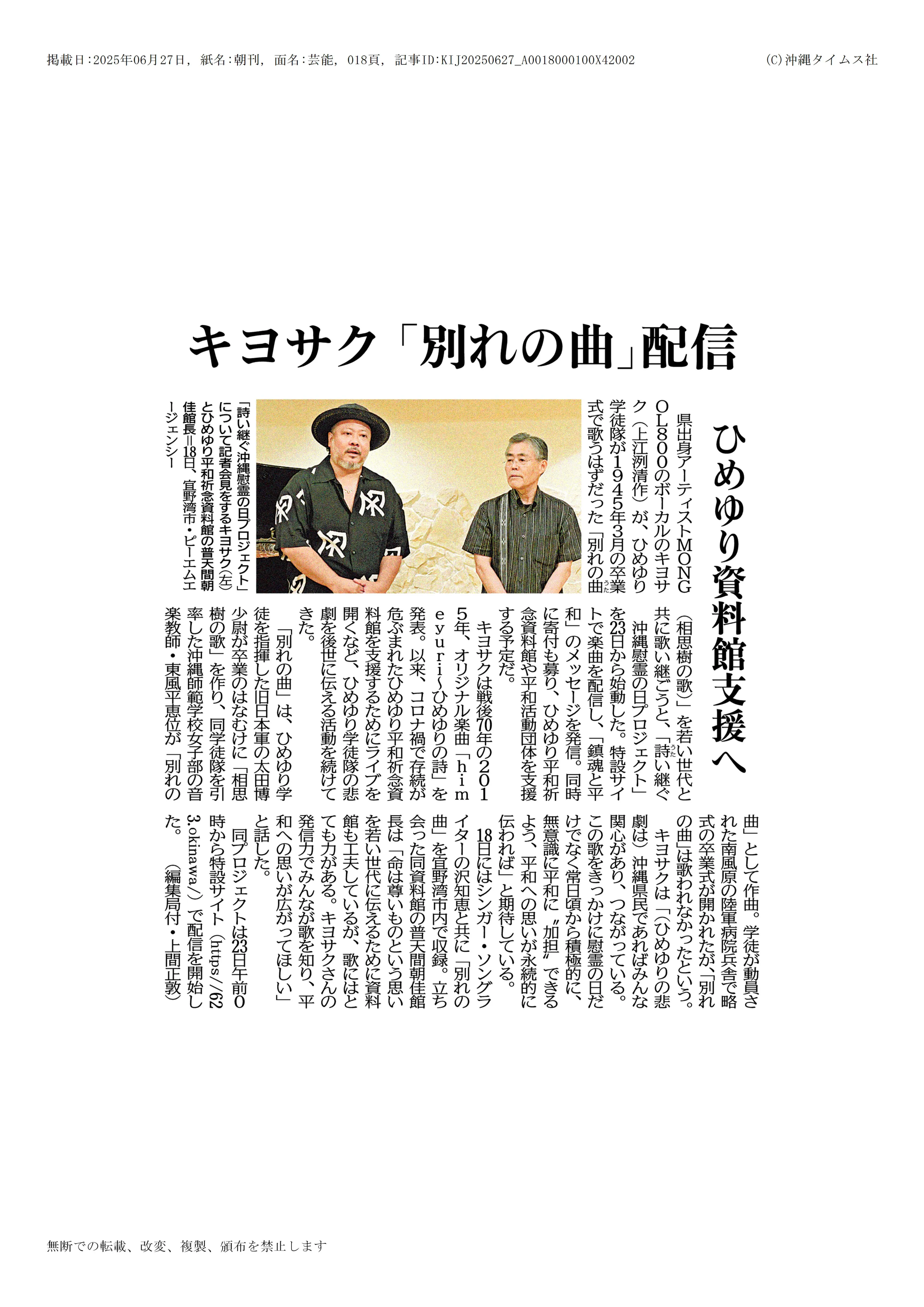 このたび「詩い継ぐ沖縄慰霊の日プロジェクト」に賛同してくださり、無償でのご提供です。感謝申し上げます。